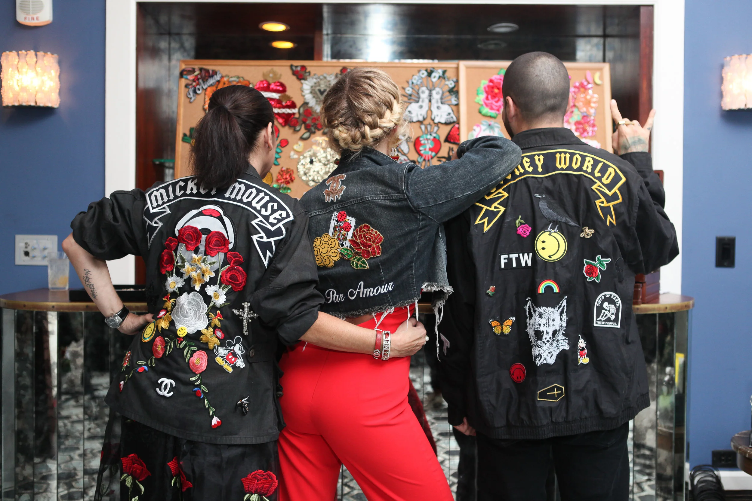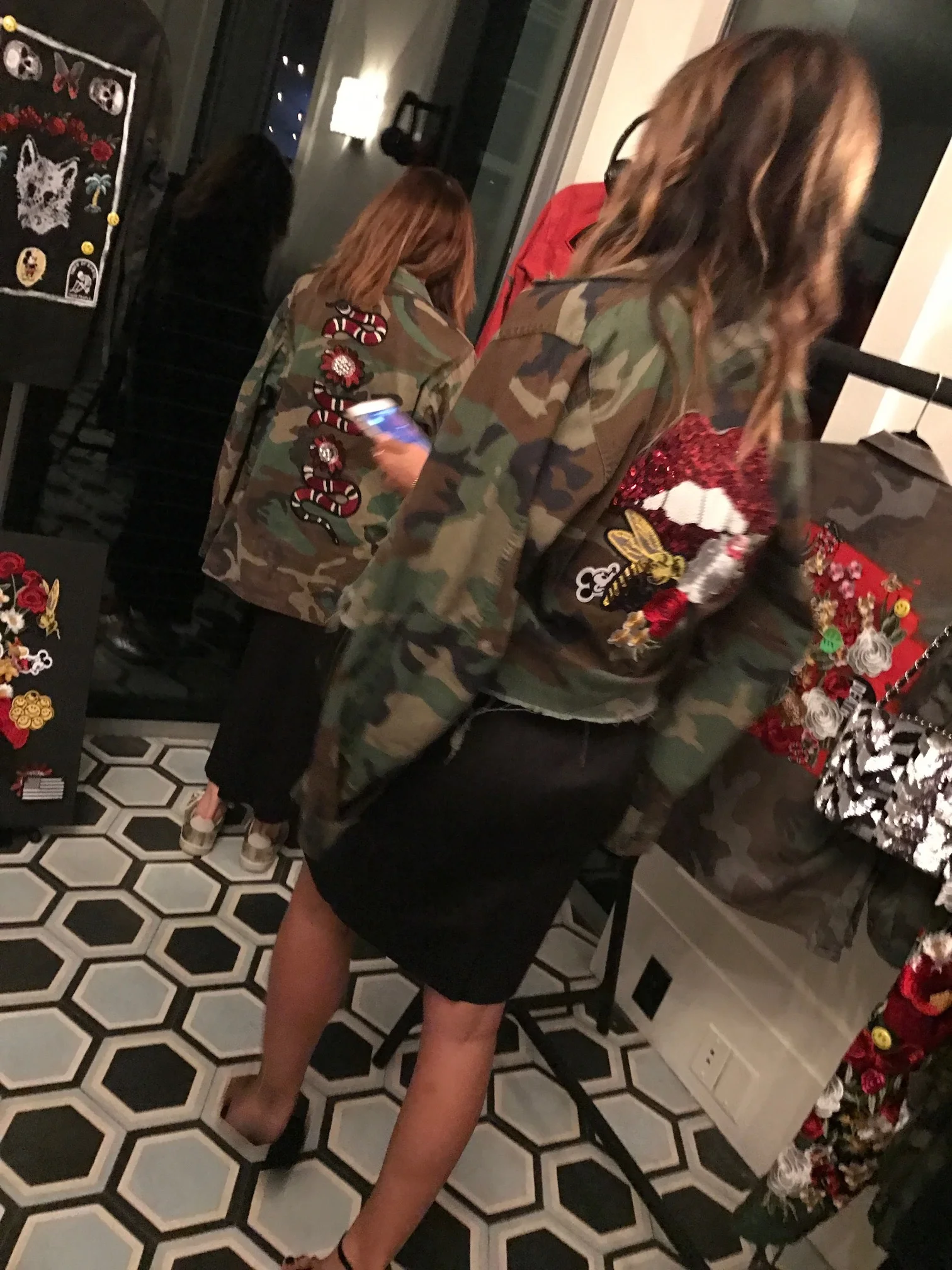 The collection features a mix of patches, paint, dye and vintage brooches on vintage denim and camo jackets. Each piece is a one of kind, hand-sewn piece of art.